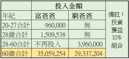 富爸爸從20歲開始,每年投資12萬台幣(每個月存1萬元到投資帳戶),假設放入10%利率的投資組合,在28歲就不再增加金額到投資帳戶,但是28歲時本金已來到1,509,538元,不再投入資金但是持續複利也不提早領出,60歲有35,059,254元